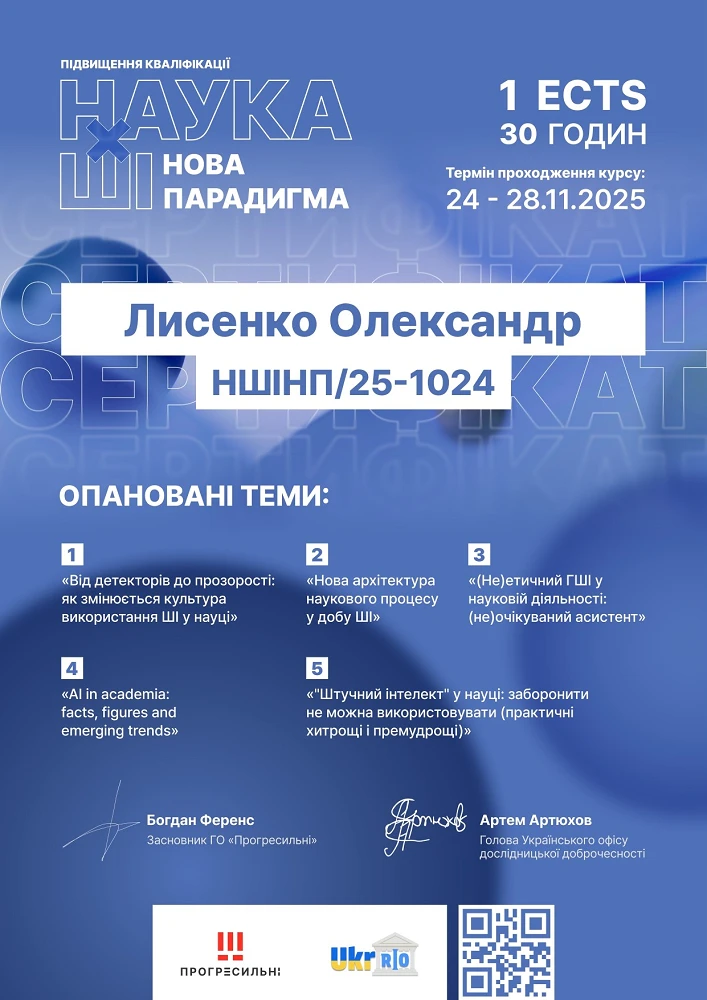 Курс підвищення кваліфікації «Наука ✕ ШІ: нова парадигма». (ГО «Прогресильні» спільно з Українським офісом дослідницької доброчесності, Україна). 24.11.2025 – 28.11 2025 року. 1 кредит ЄКТС (30 годин)