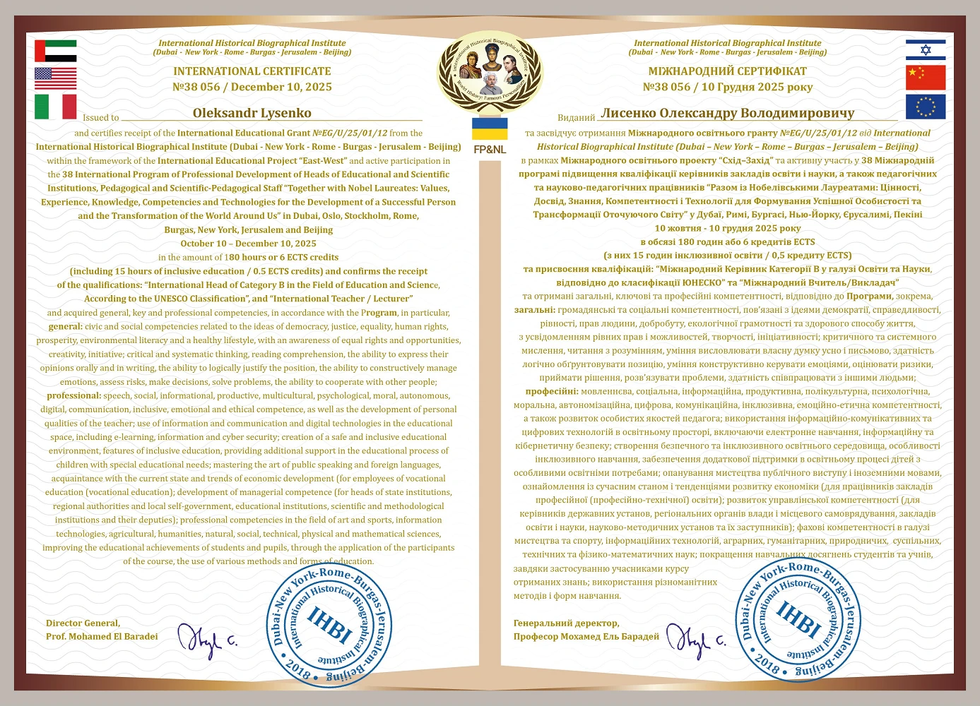 Міжнародна програма підвищення кваліфікації "Разом із Нобелівськими Лауреатами". International Historical Biographical Institute (Dubai - New York – Rome – Jerusalem - Beijing). 10.10.2025-10.12.2025 року. 6 кредитів ЄКТС (180 годин)
