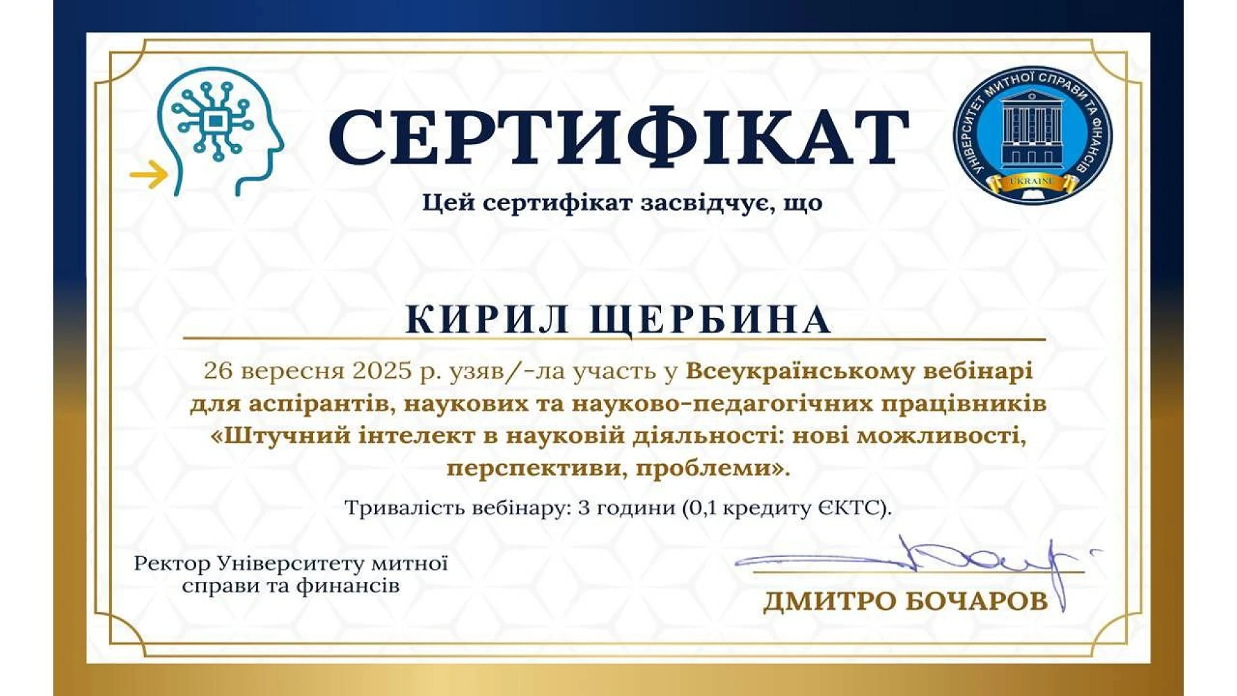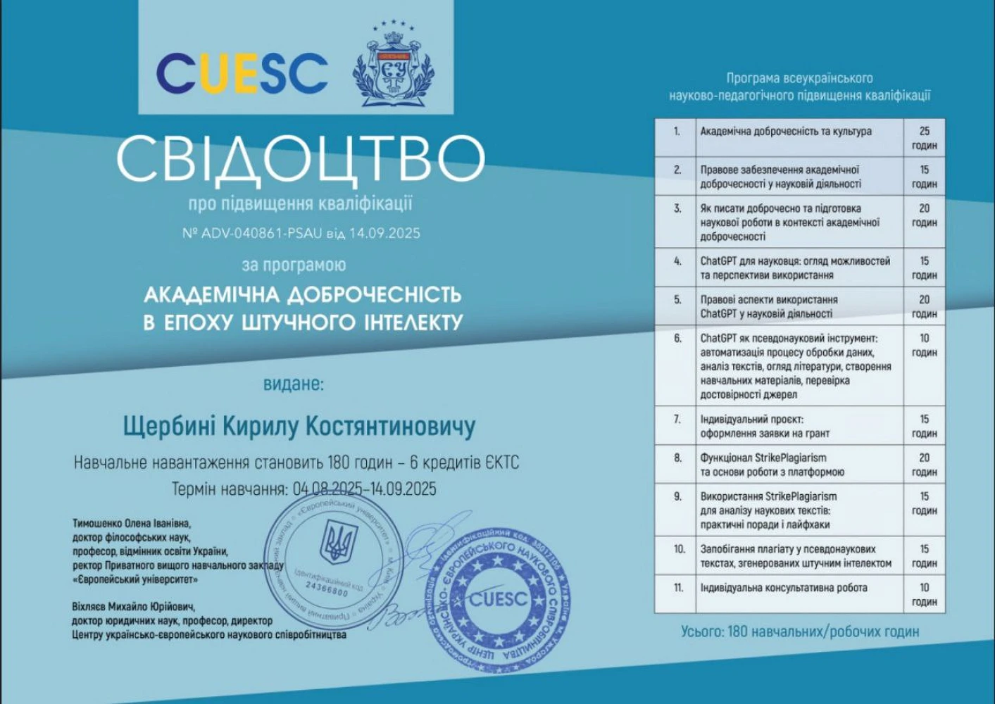 Щербина Кирил Костянтинович. Сертифікати